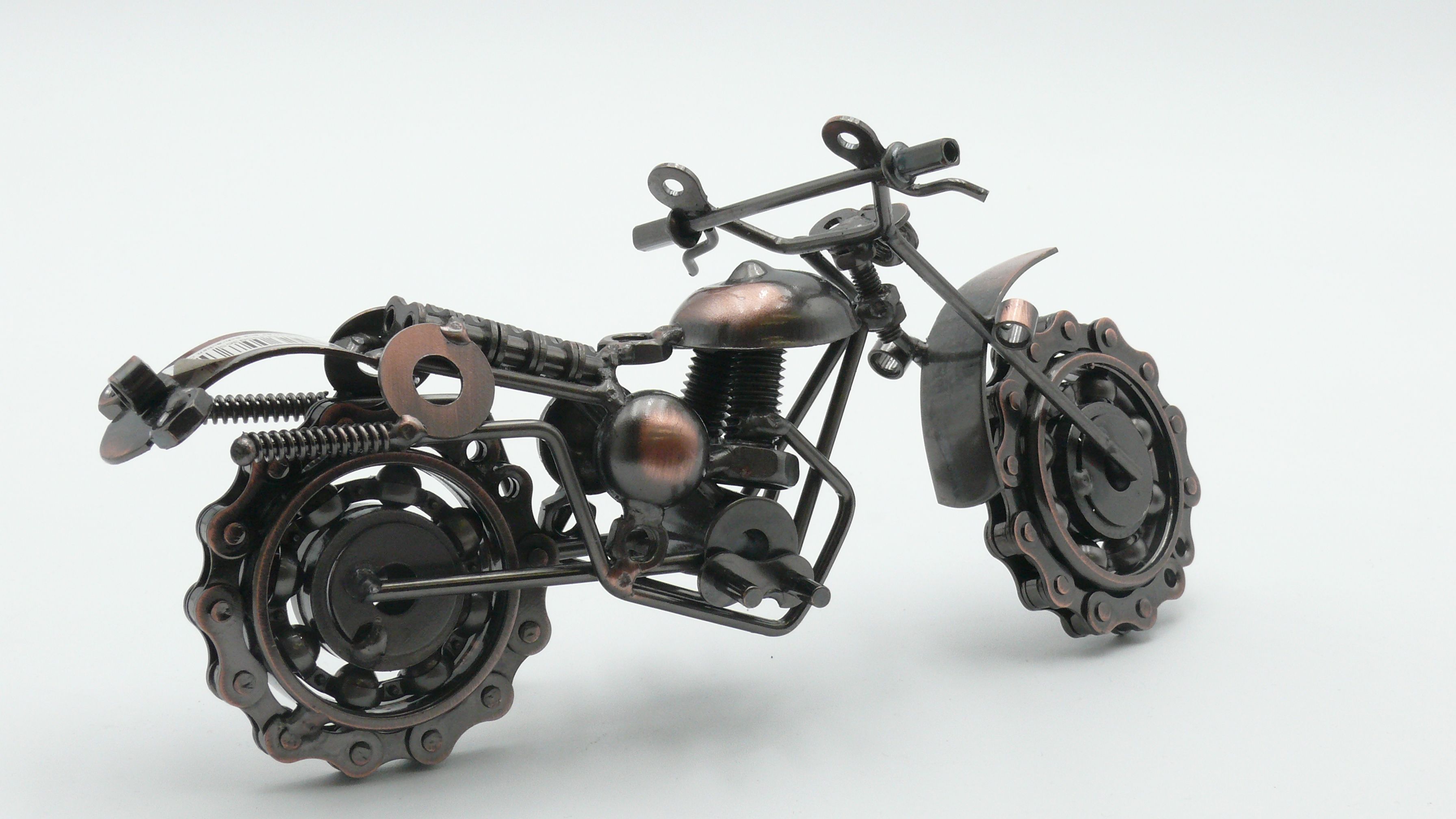 Dieses dekorative Deko-Motorrad ist aus diversen Metallteilen zusammengesetzt, die verschiedene Tile des realen Motorrads nachahmen. So sind die Scheinwerfer Muttern, Schlauchleitungen aus Metallfedern und die Reifen aus Kettenglieder.